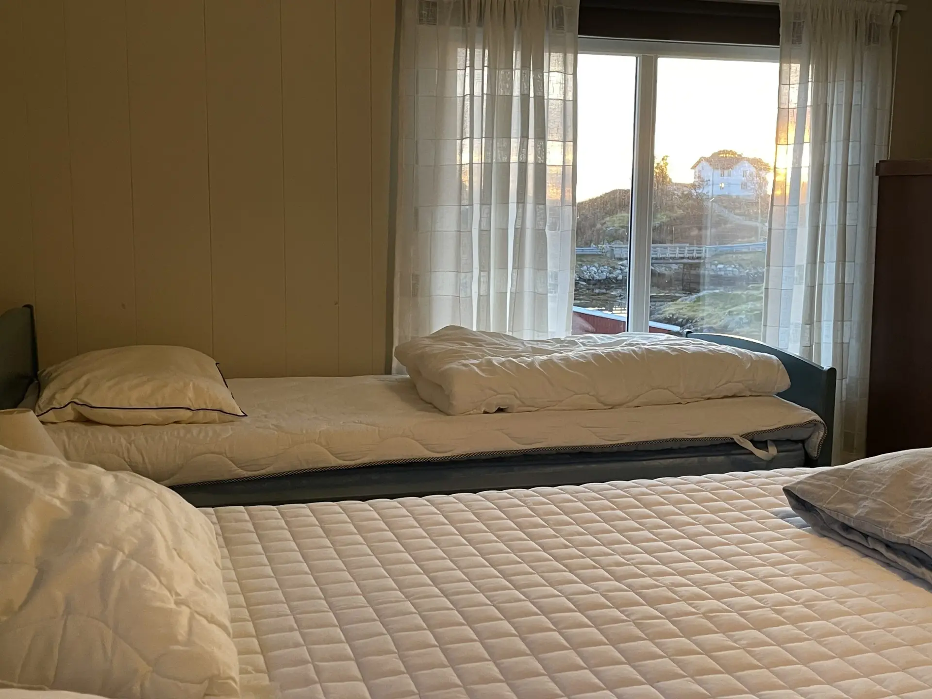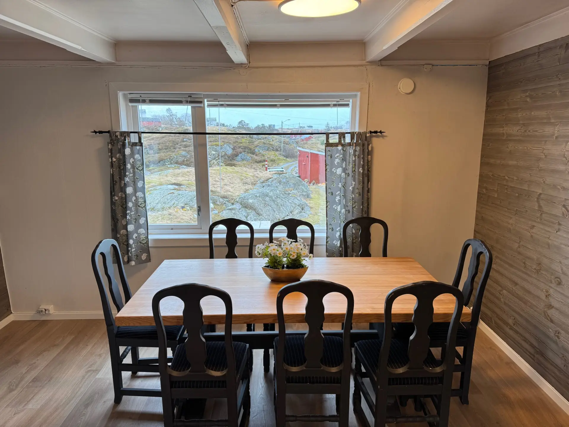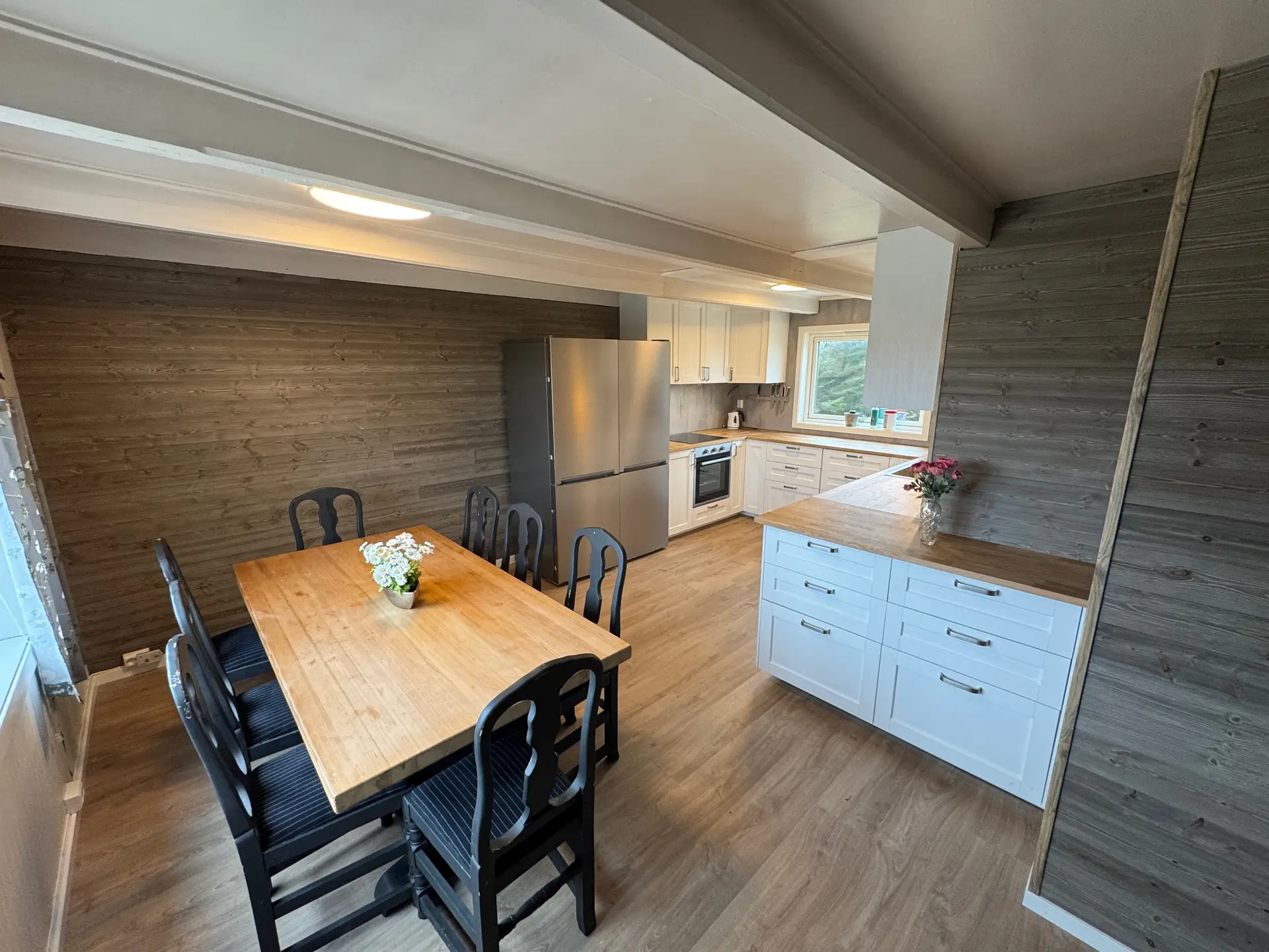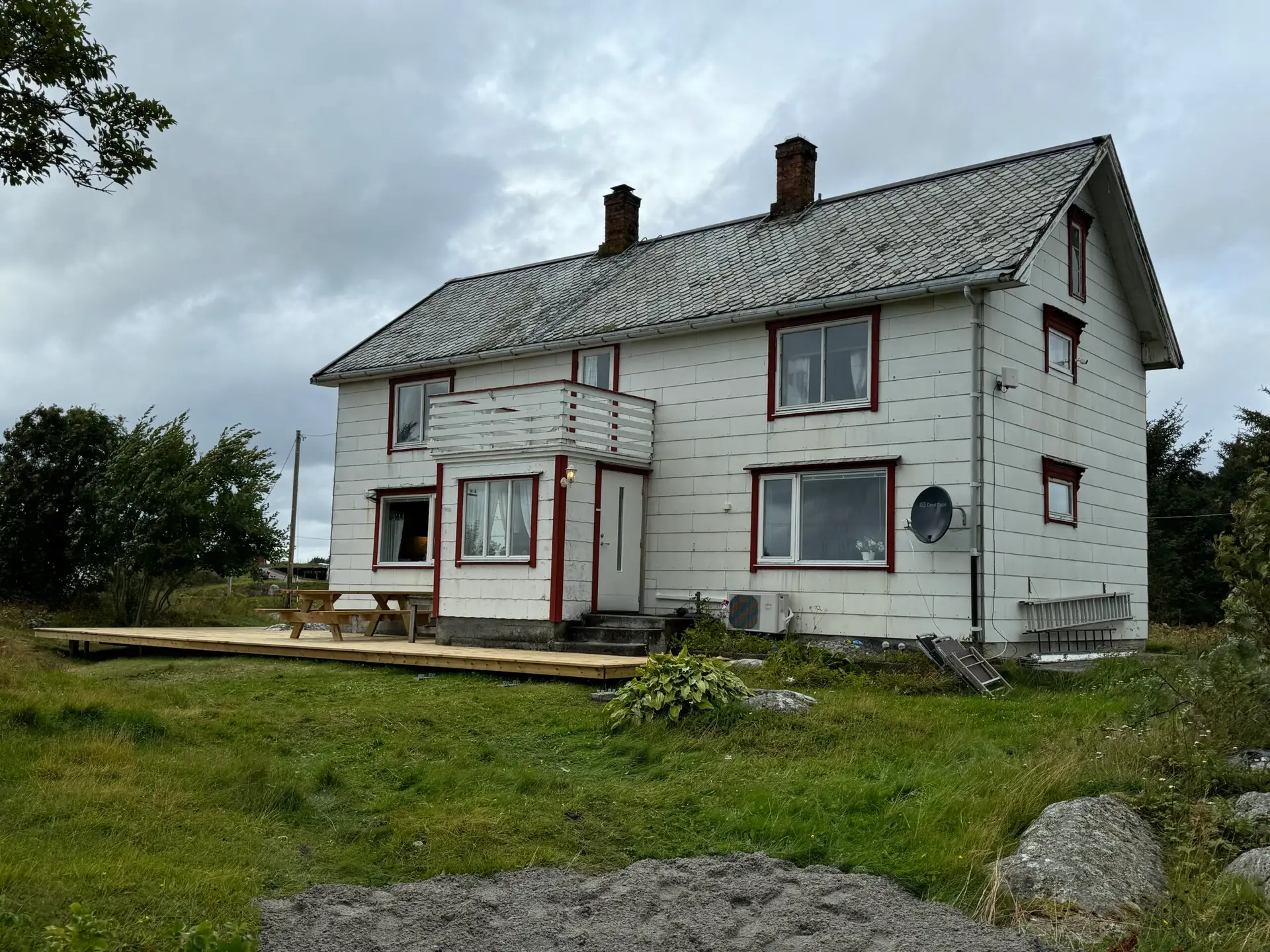 Huset ligger 2km fra rorbuene på en 5000m2 privat tomt: 130m2 over 2 etasjer, 4 soverom med soveplass for opp til 10 personer, 2 bad, 1 stort fullt utstyrt kjøkken og en stor stue.