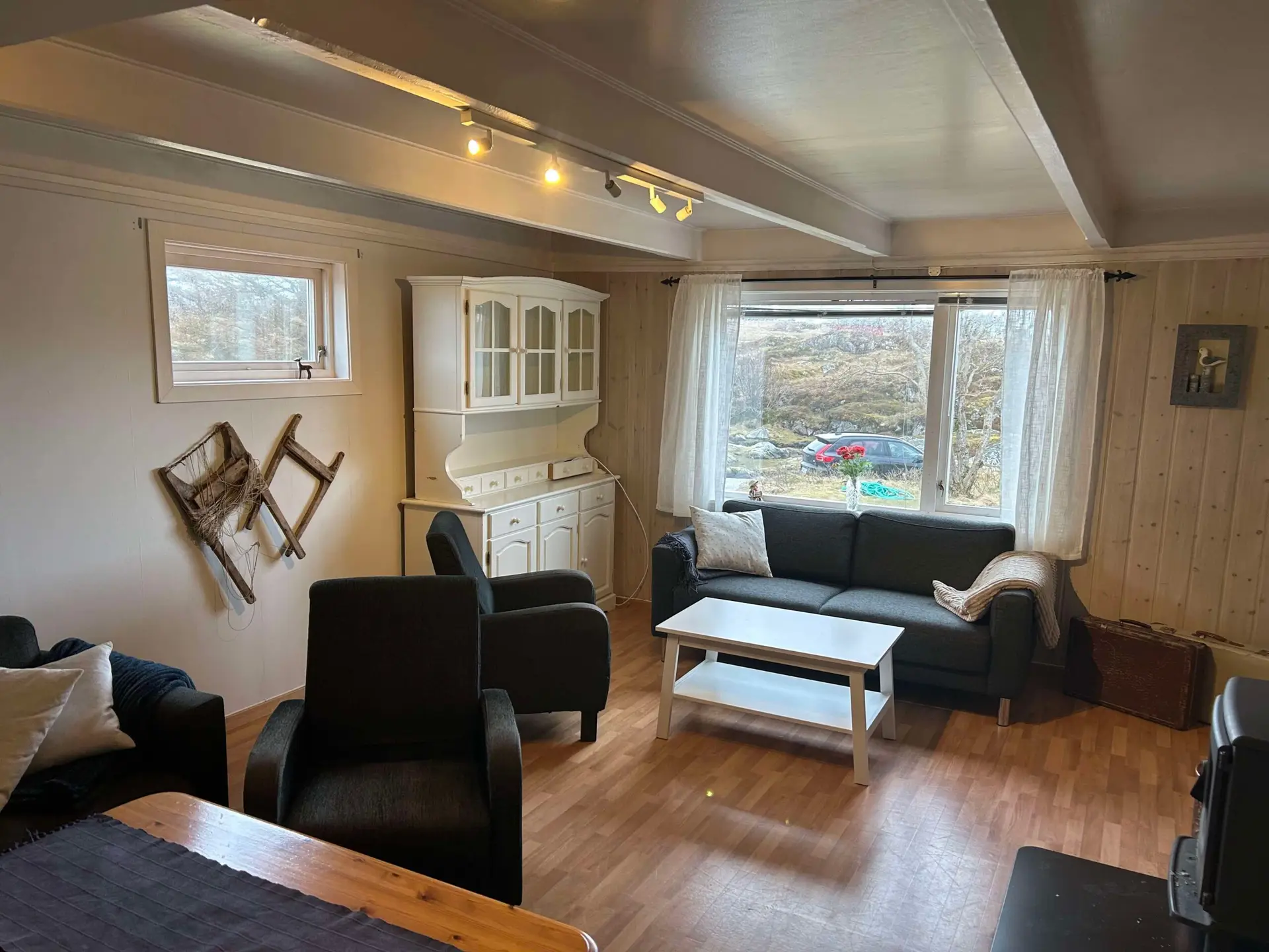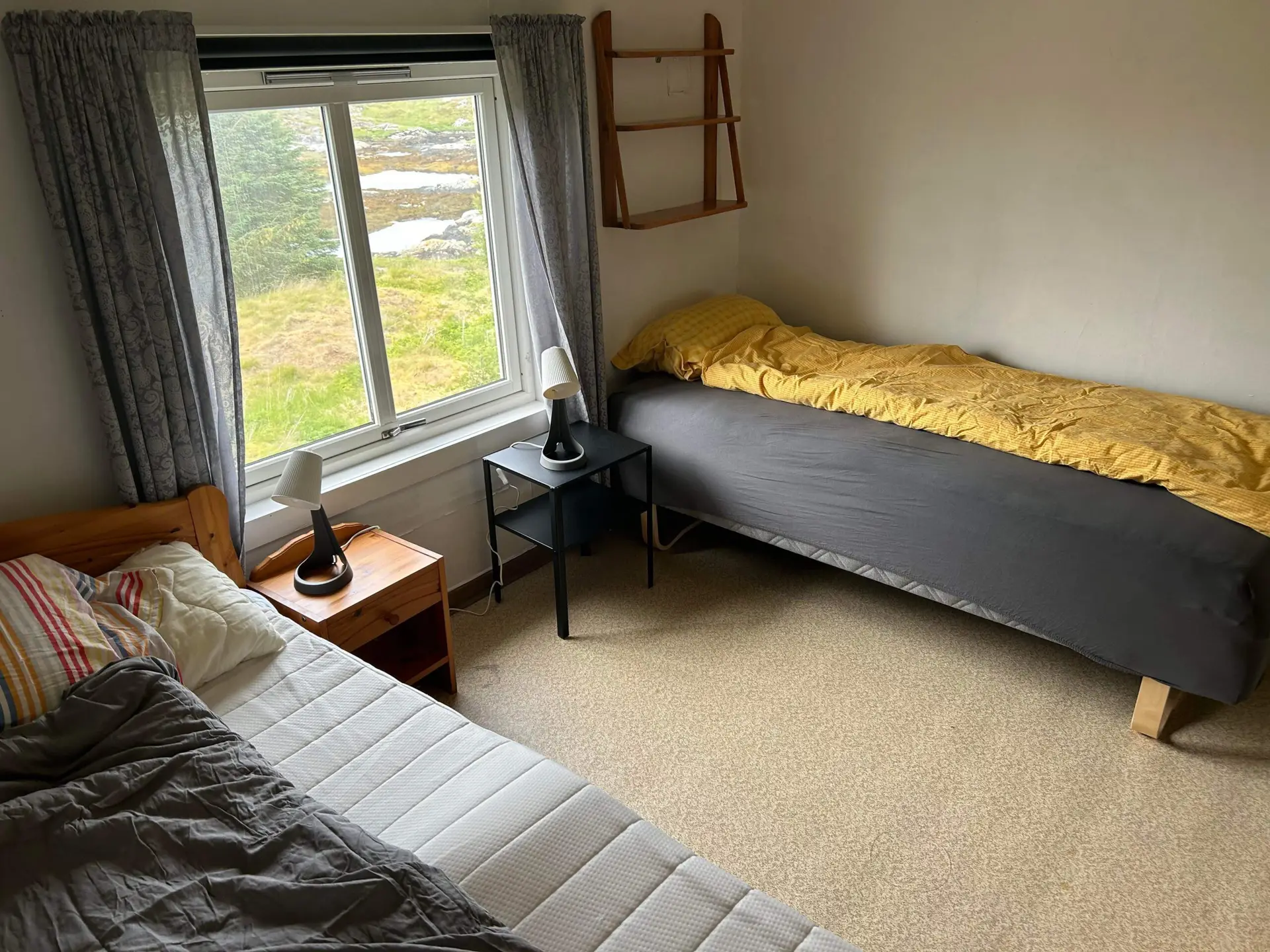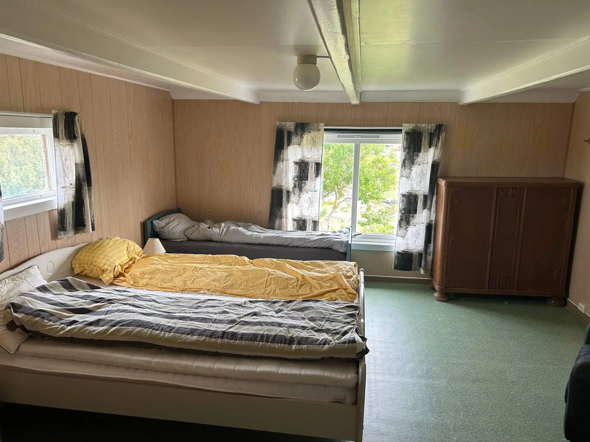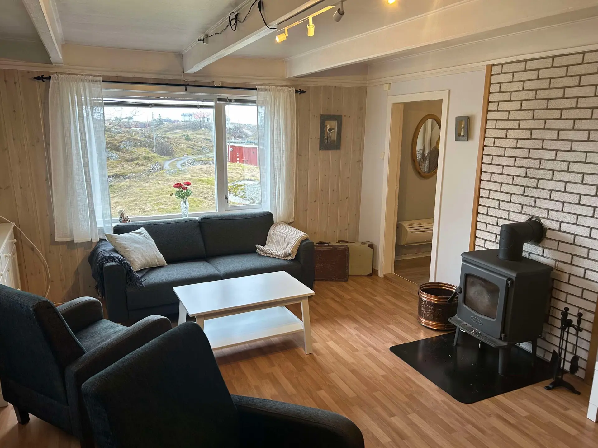 Huset ligger 2km fra rorbuene på en 5000m2 privat tomt: 130m2 over 2 etasjer, 4 soverom med soveplass for opp til 10 personer, 2 bad, 1 stort fullt utstyrt kjøkken og en stor stue.