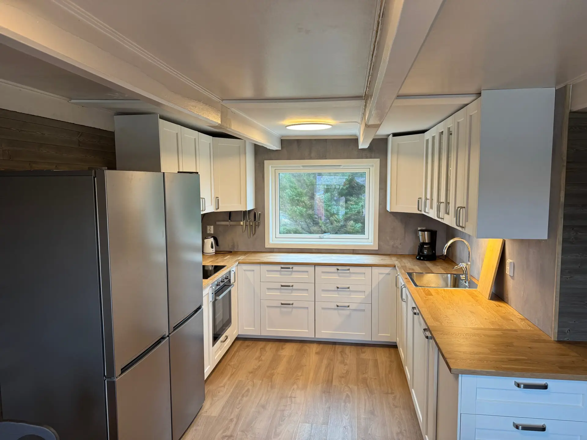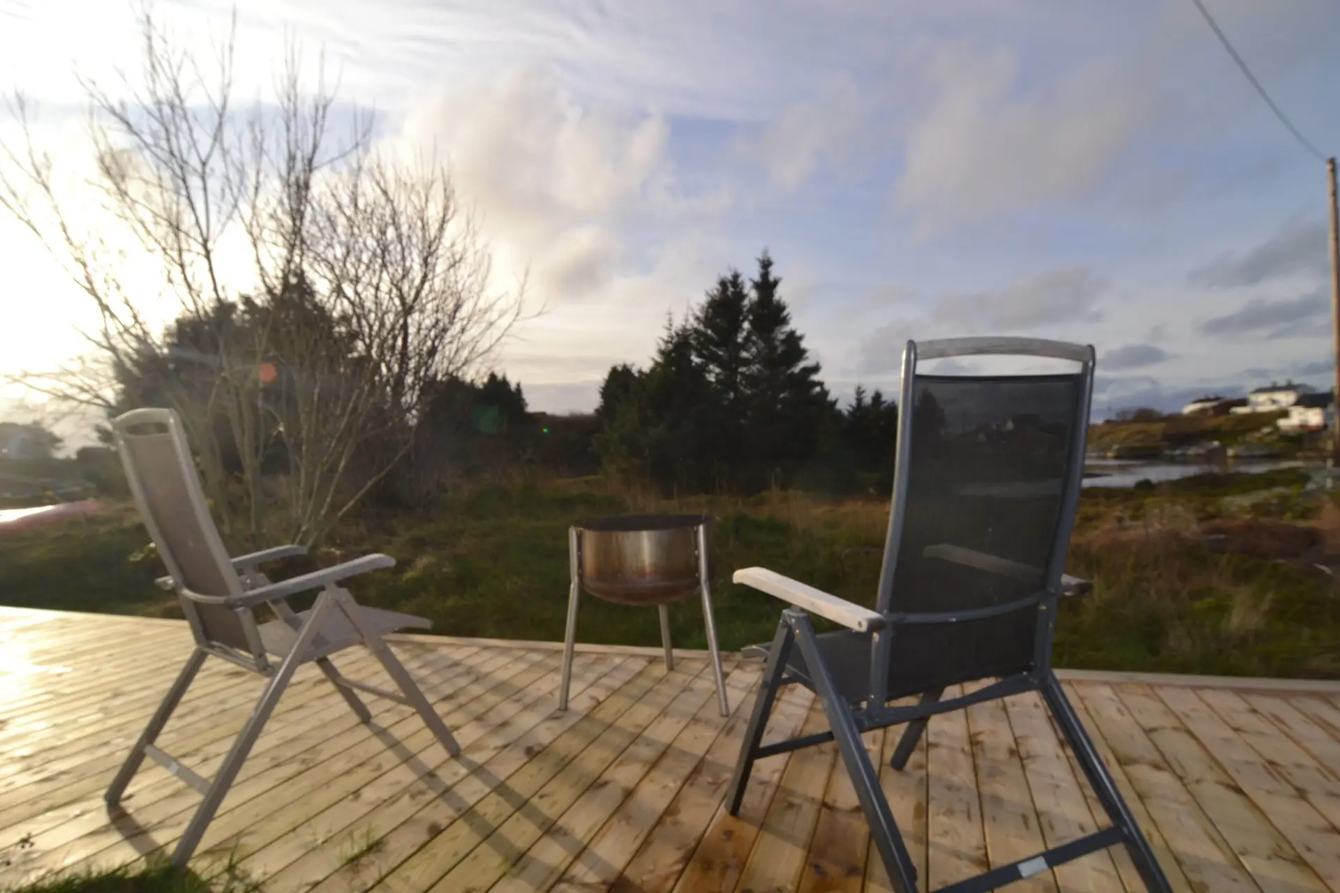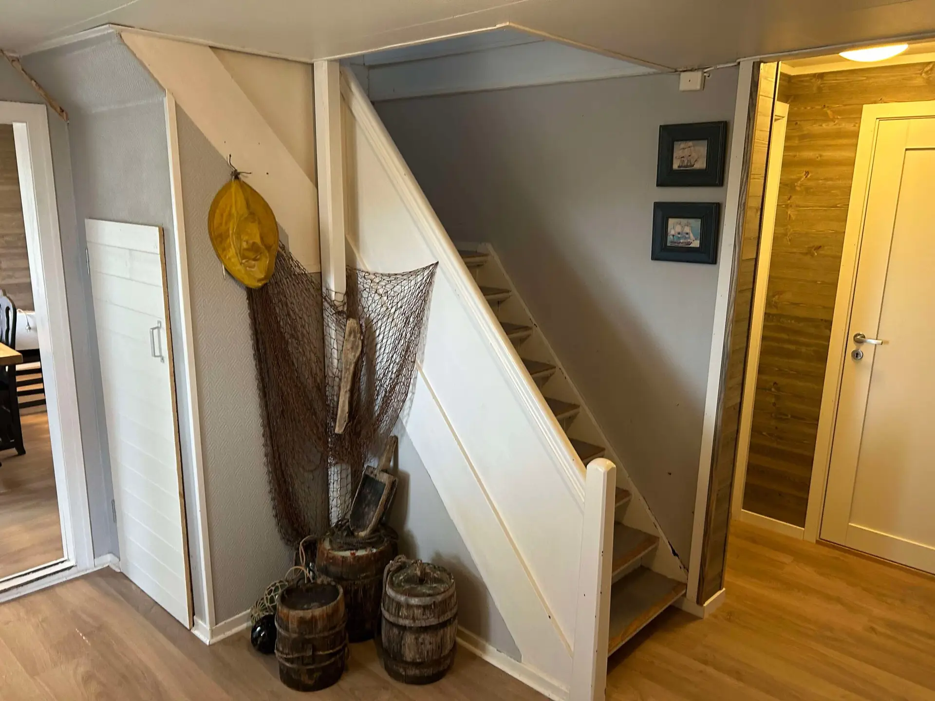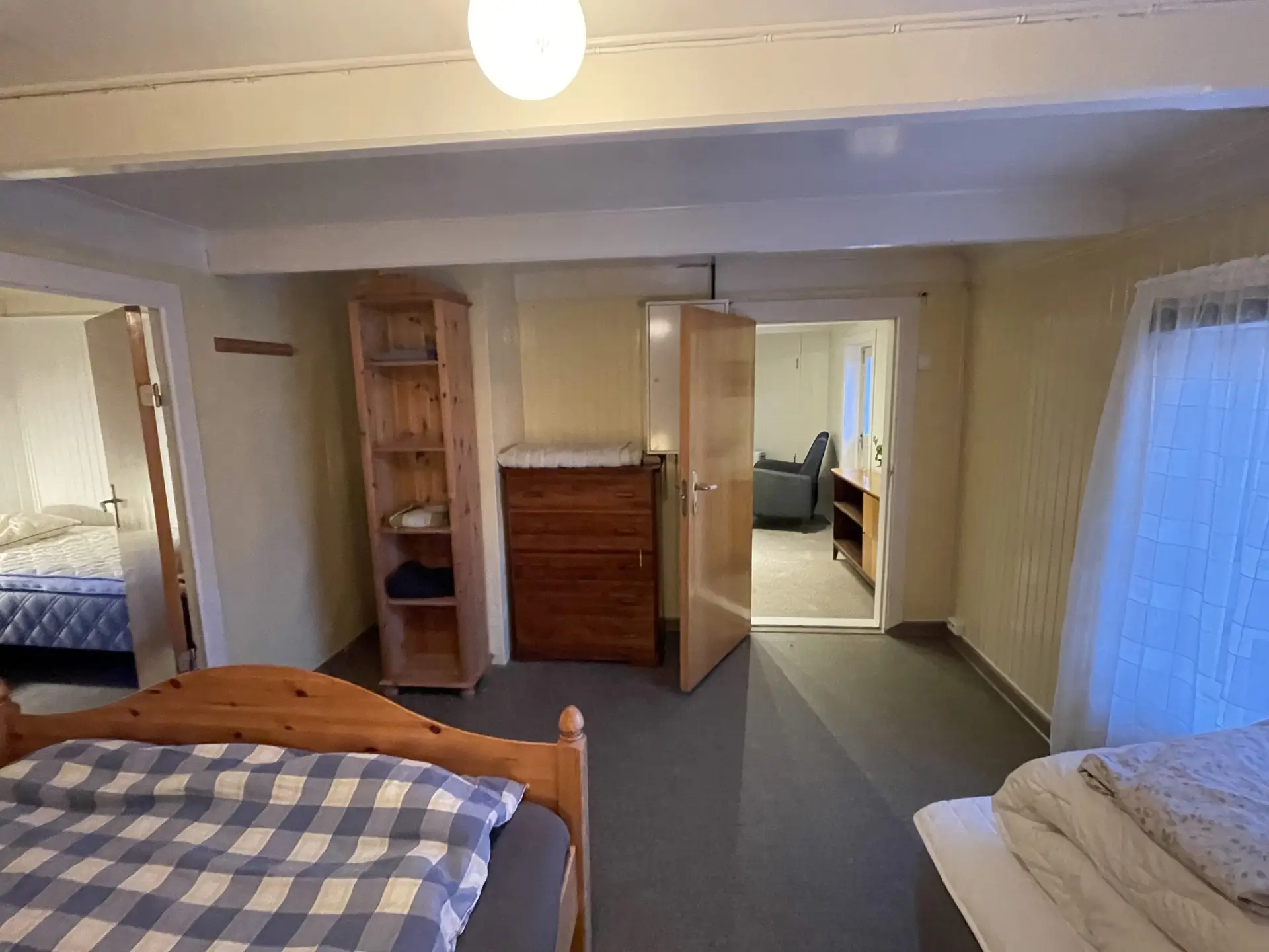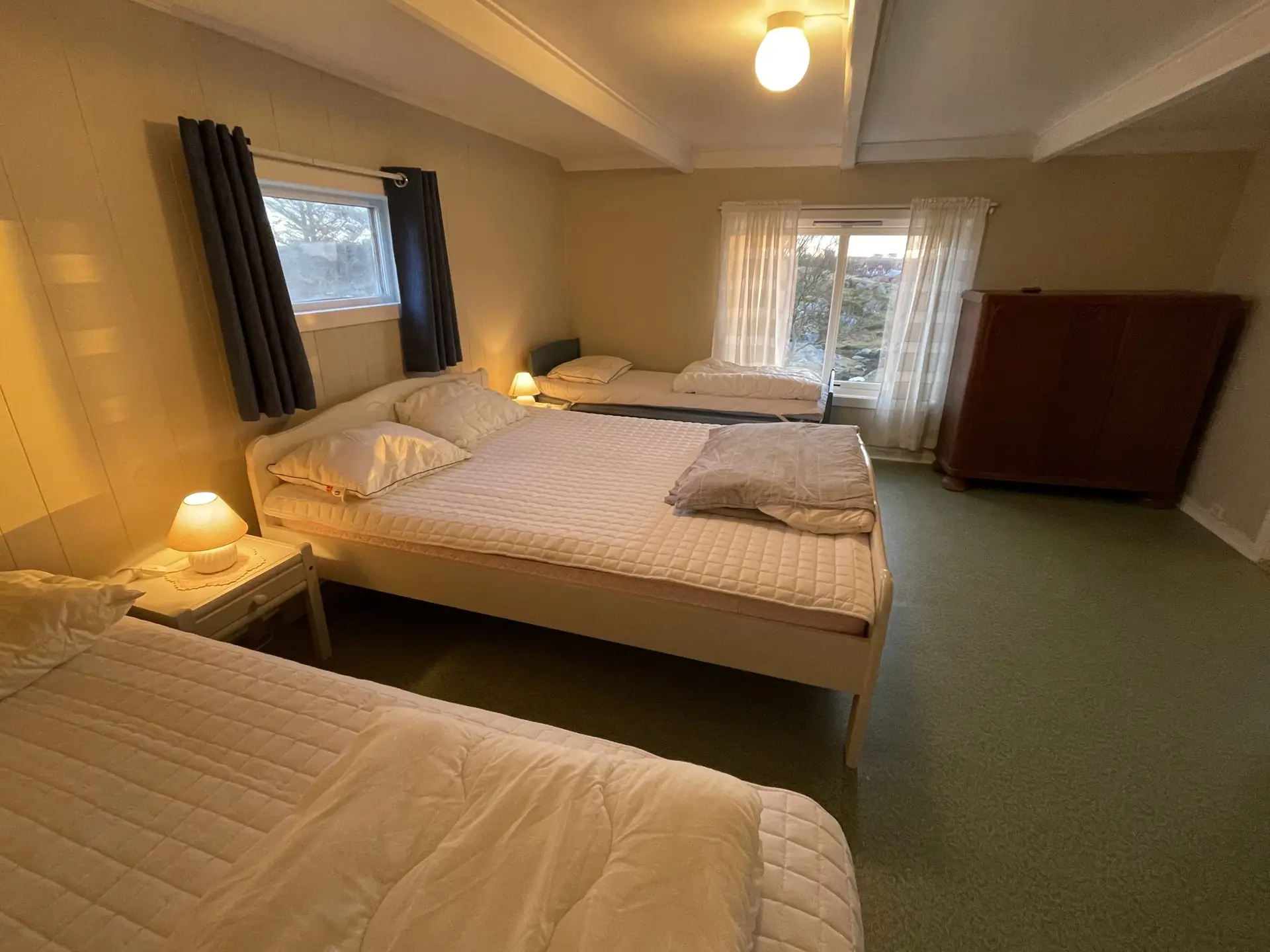 Huset ligger 2km fra rorbuene på en 5000m2 privat tomt: 130m2 over 2 etasjer, 4 soverom med soveplass for opp til 10 personer, 2 bad, 1 stort fullt utstyrt kjøkken og en stor stue.
