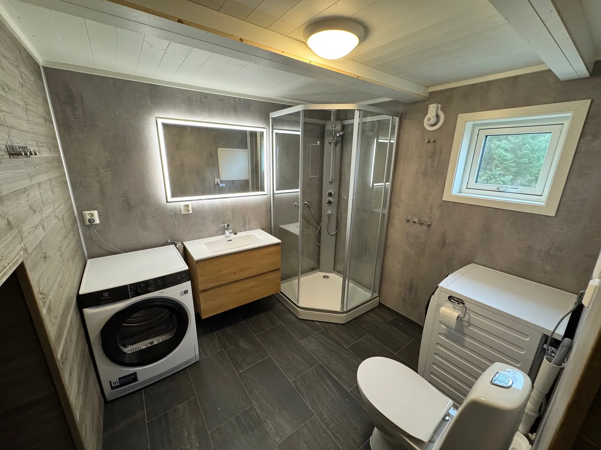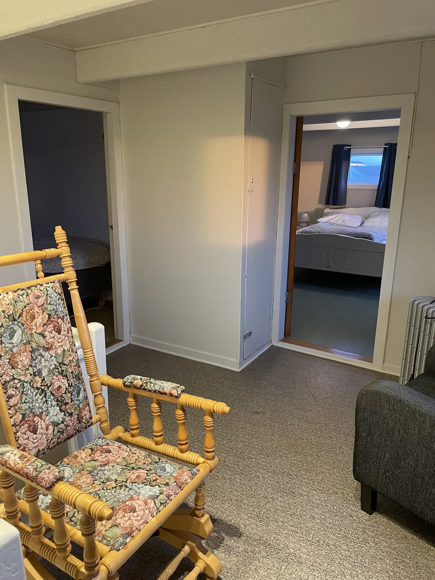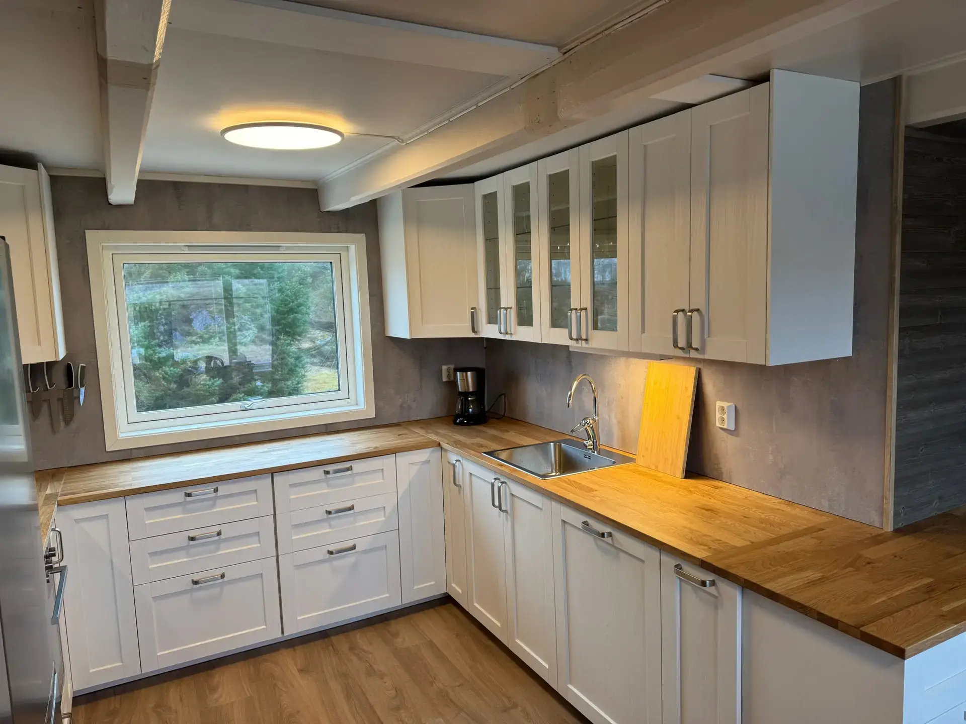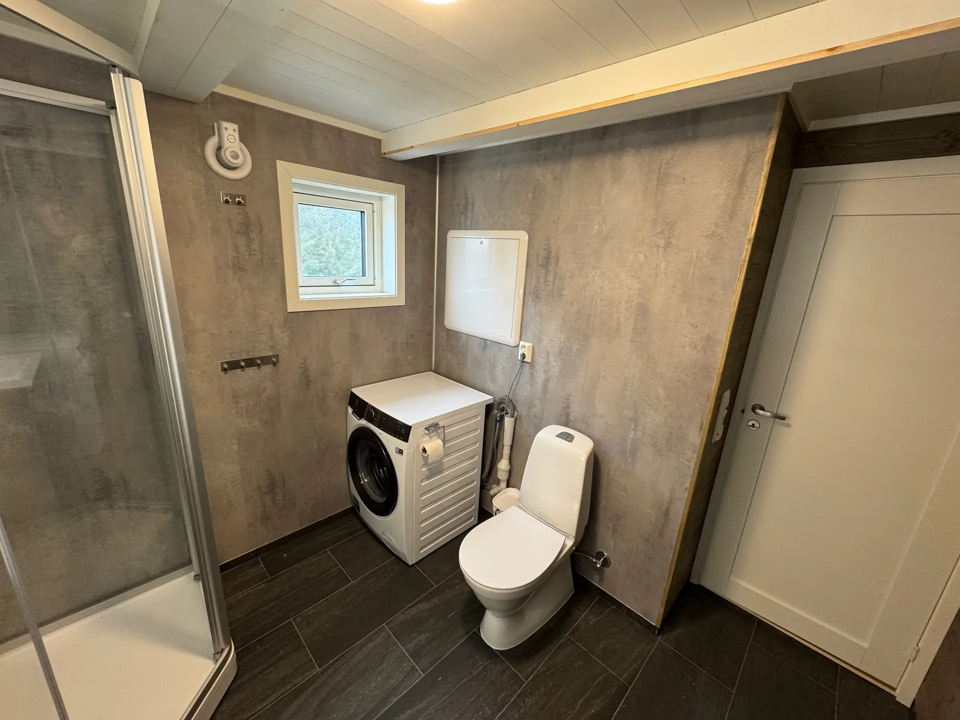 Huset ligger 2km fra rorbuene på en 5000m2 privat tomt: 130m2 over 2 etasjer, 4 soverom med soveplass for opp til 10 personer, 2 bad, 1 stort fullt utstyrt kjøkken og en stor stue.